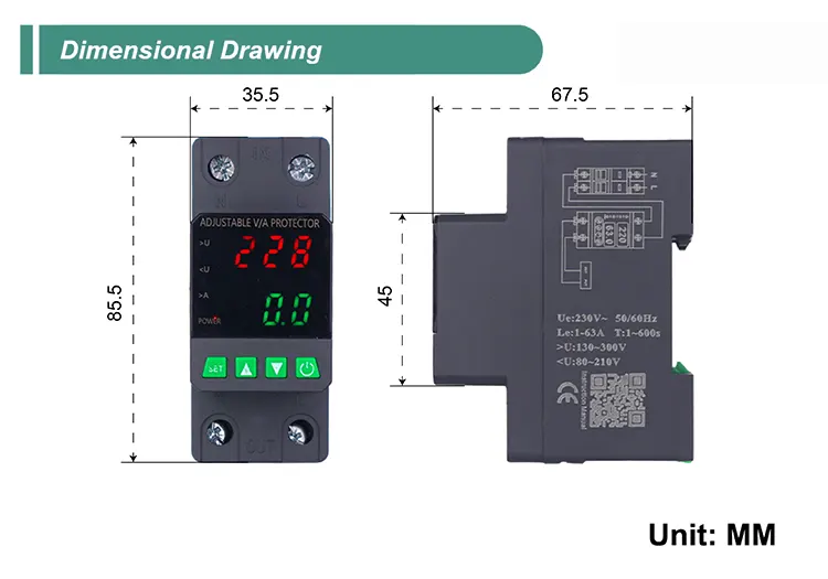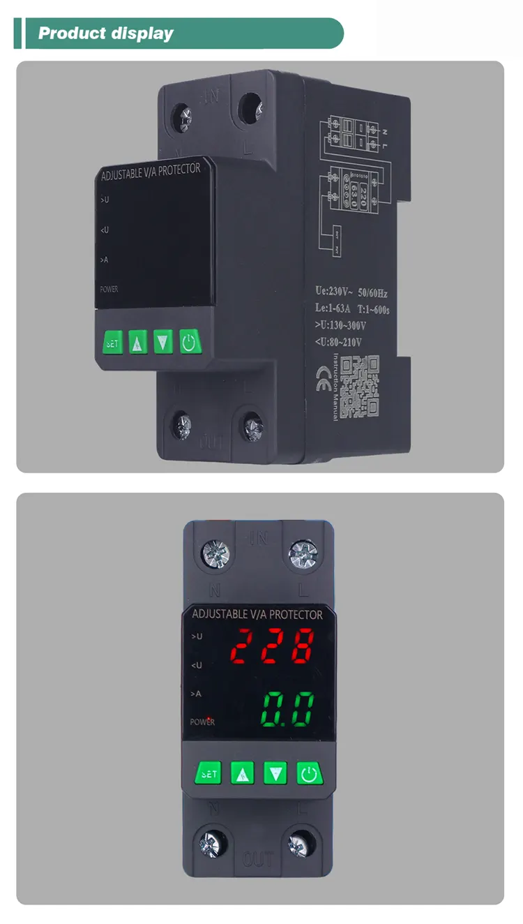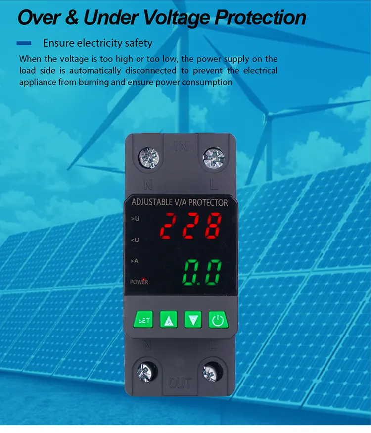 Rəqəmsal bir ekranla təchiz olunmuş və idxal olunan modul elektron komponentlərlə istehsal olunan, yüksək etibarlılıq və performansına malikdir. Qoruyucu, anormal gərginliklərdə (məsələn, overvoltaj, sarsılmaz və ya grid dalğalanmaları zamanı) elektrik enerjisini avtomatik olaraq azaldır və gərginlik normal vəziyyətə qayıtdıqdan sonra enerji təchizatı bərpa edir.
